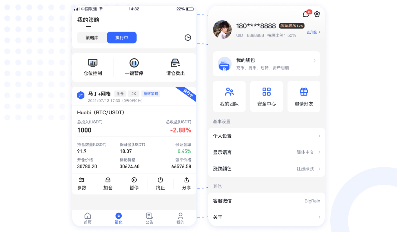 量化交易機解決方案:系統中設定交易策略,讓系統機器人自動執行交易的一種方式,通過檢測行情走勢各種指標,判斷買入、賣出時機,讓用戶盈利最大化。